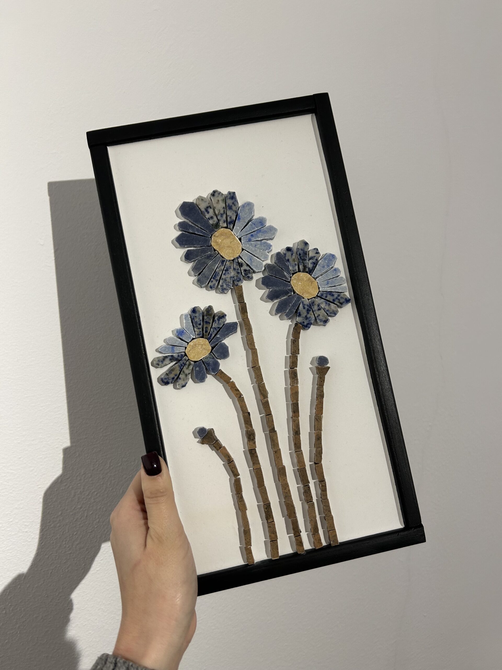 Композиція виконана з пелюсток із синіх мармурів, які надають квітам глибини та сучасного характеру. Жовта серединка створює яскравий акцент і оживляє композицію, а коричневе стебло врівноважує кольорову гаму, підкреслюючи природну форму ромашок.
