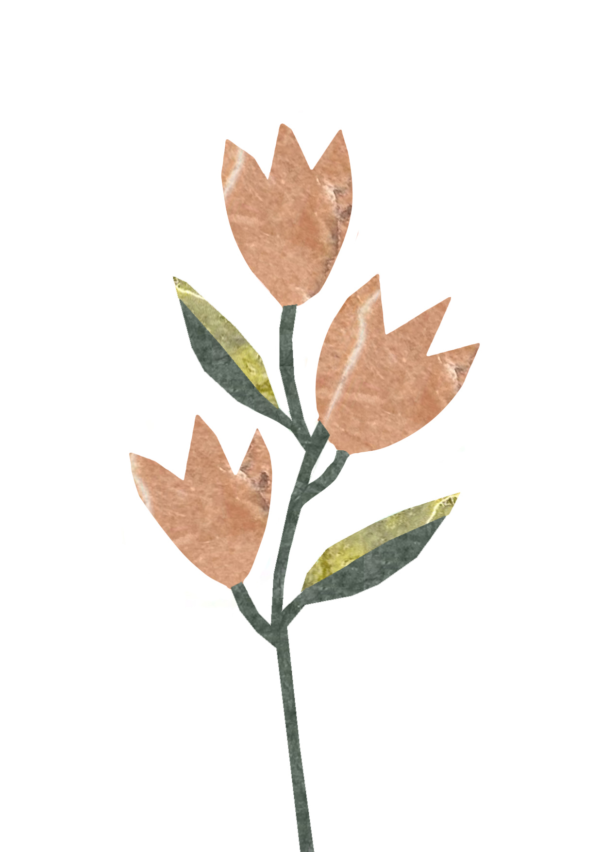 Композиція виконана у вигляді стилізованих тюльпанів з мармуру Rosa Lia — з ніжними рожево-бежевими відтінками та природними прожилками каменю. Зелені мармурові листочки та стебла додають свіжості й балансу, підкреслюючи природну красу квітів та створюючи гармонійний контраст.